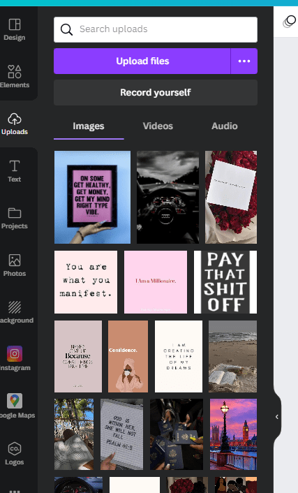 *If you didn’t save your photos from Pinterest, you can click on the “Photos” button right under the upload one and use Canva’s built-in photo library.